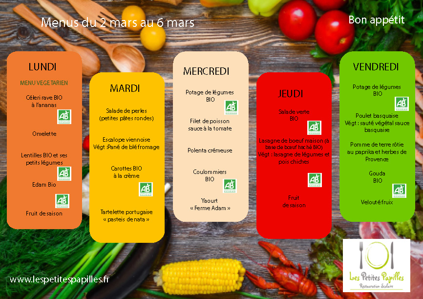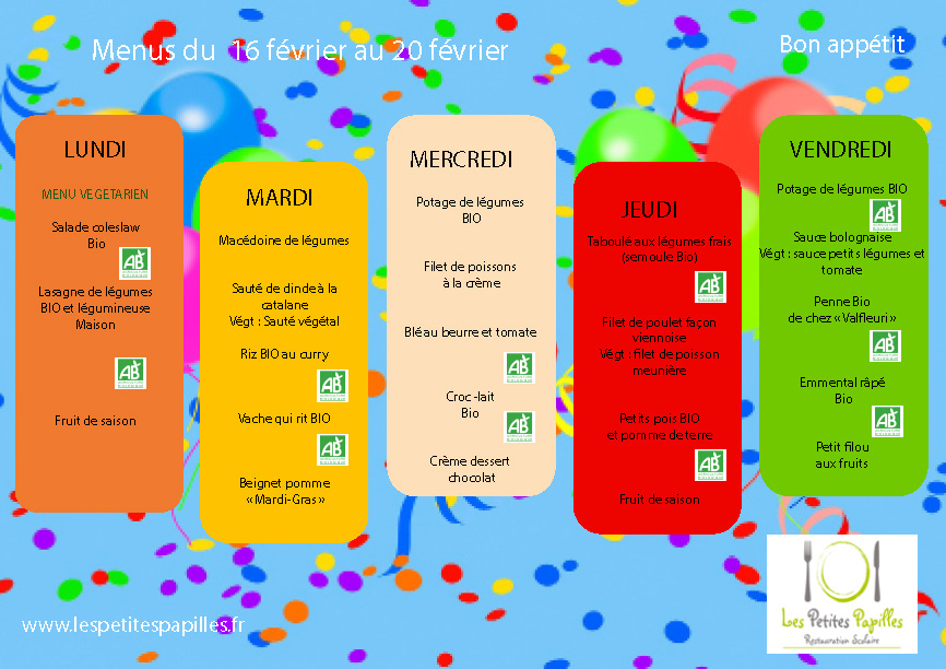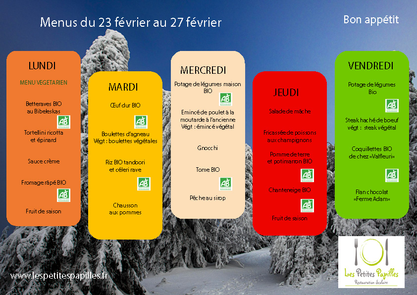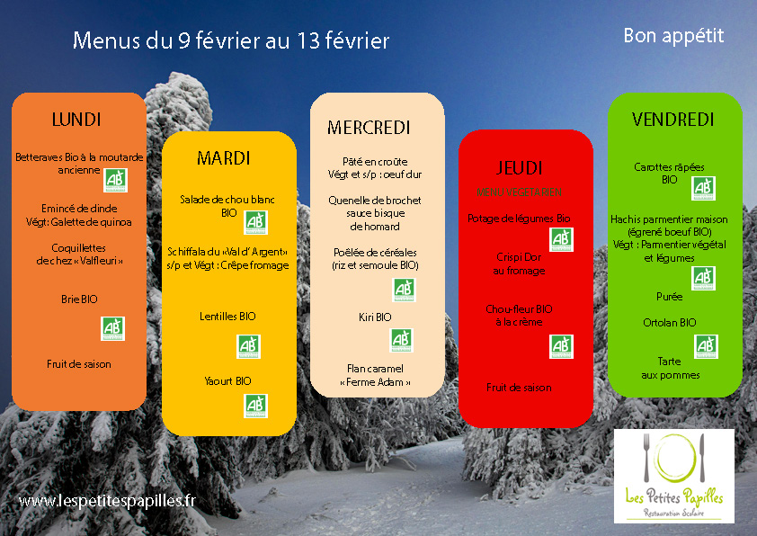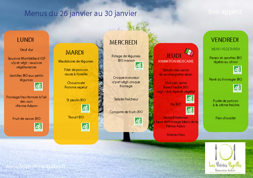Menus du lundi 26 janvier au vendredi 06 mars 2026